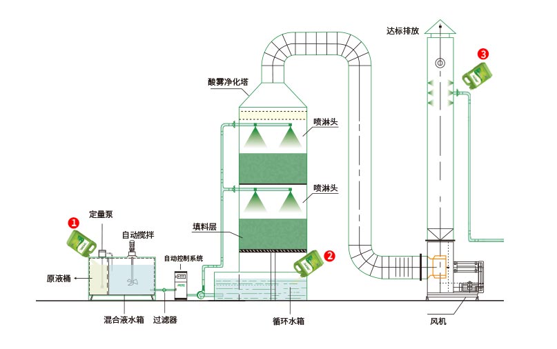 針對現場有組織排放的廢氣進行處理,惡臭廢氣加蓋收集后,或車間廢氣使用風機、集氣罩收集后,在噴淋塔內的循環水中加入工業除臭劑,操作簡單。
